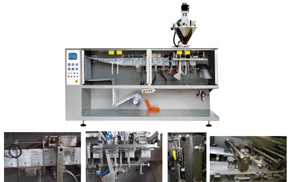 This machine can be used to fill and package powder type products like milk powder, instant coffee, instant powder drinks into the 4 side seal sachet type packages. This 4 side seal sachet packaging machine is used to produce single piece sachet of 4-side sealed bag. It can do the work of folding, cutting, bag-forming, code-printing and counting. Fully 304 stainless steel construction. PLC based with easy to use touch screen to operate the machine. The sachet size range that the base machine produces, is 60mm x 140mm, up to 50mm x 130mm, with speeds up to 60 sachets per minute. Depending on the weight range and sachet sizes these speeds vary.