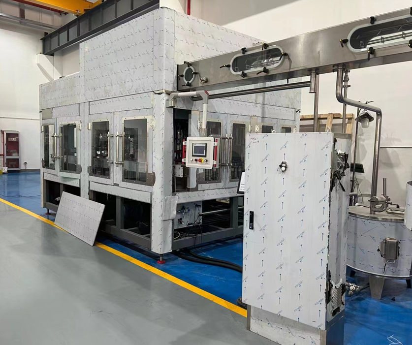The bottles are fed into the system one by one, and we arrange them into 4×6 configurations. During the sorting process, the bottles are pre-arranged into 4×6 groups, with each sorting cycle handling approximately three to four boxes. These boxed bottles queue at the waiting station until four boxes are accumulated, then they move on to the next step.