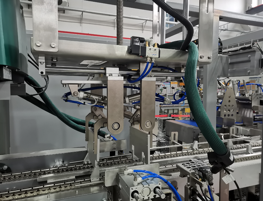 - The front box-pressing cylinder baffle presses down, using a cam mechanism to achieve the front folding and pressing of the cardboard. The forward and backward movement of the baffle compresses the front edges of the carton.