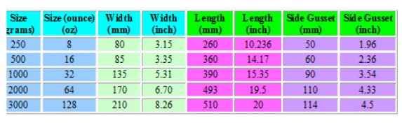 Side gusseted bags is available ready in stock in the following size given in the table below{these side gusseted bags has NO RESEALABLE ZIPPER.}.....